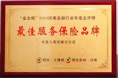 近期,由騰訊•大豫網主辦的2019年度“金企鵝”獎——河南金融行業年度總評榜頒獎典禮在鄭州舉行。中意人壽河南省分公司獲膺“最佳服務保險品牌”獎項。