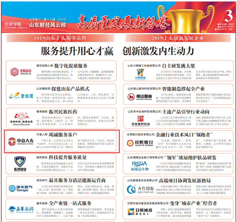【新聞—山東省分公司】中意人壽山東省分公司榮膺"2019山東十大服務(wù)品牌"