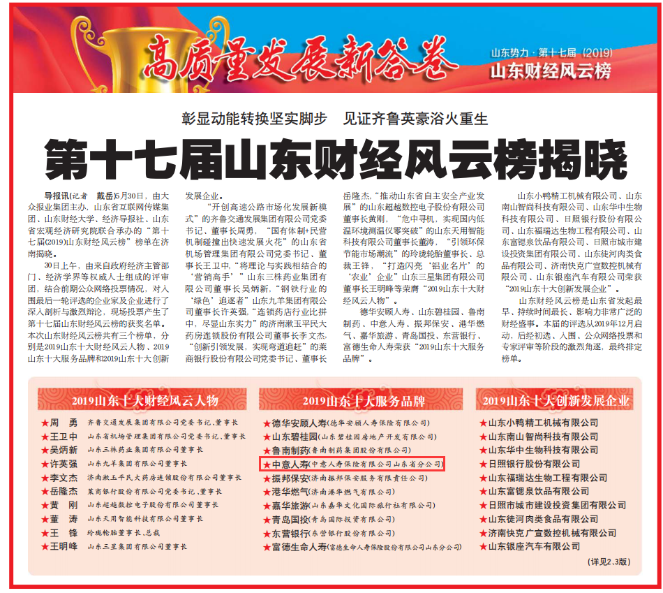 5月30日,由大眾報(bào)業(yè)集團(tuán)主辦,山東省互聯(lián)網(wǎng)傳媒集團(tuán)、山東財(cái)經(jīng)大學(xué)、經(jīng)濟(jì)導(dǎo)報(bào)社、山東省宏觀經(jīng)濟(jì)研究院聯(lián)合承辦的“第十七屆(2019)山東財(cái)經(jīng)風(fēng)云榜”榜單在濟(jì)南揭曉。山東財(cái)經(jīng)風(fēng)云榜是山東省發(fā)起最早、持續(xù)時(shí)間最長(zhǎng)、影響力非常廣泛的財(cái)經(jīng)盛事。