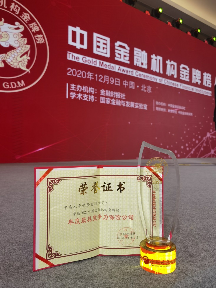 12月9日,由金融時報社主辦、國家金融與發(fā)展實驗室提供學術支持及數(shù)據(jù)分析的“2020中國金融機構(gòu)金牌榜•金龍獎”評選結(jié)果在北京揭曉,中意人壽憑借穩(wěn)健增長的經(jīng)營業(yè)績、卓越的品牌影響力以及變革創(chuàng)新的發(fā)展模式,榮膺“年度最具競爭力保險公司”大獎。